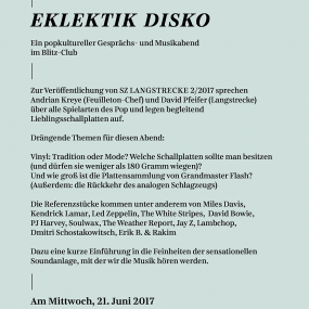 Zur Veröffentlichung von SZ LANGSTRECKE 2/2017 sprechen Andrian Kreye (Feuilleton-Chef) und David Pfeifer (Langstrecke) über alle Spielarten des Pop und legen begleitend Lieblingsschallplatten auf. Drängende Themen für diesen Abend: Vinyl: Tradition oder Mode?