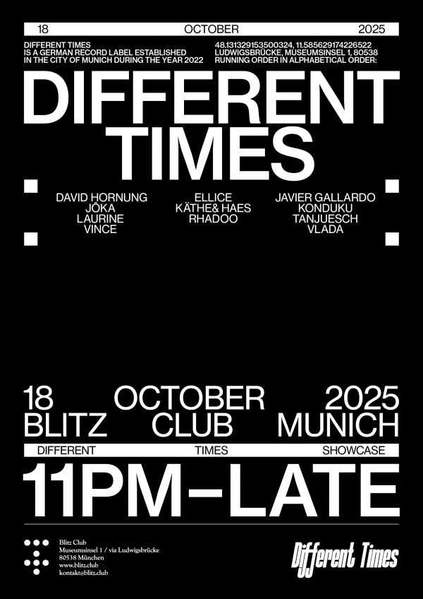 Das Münchner Label- und Kollektiv Different Times – bekannt für seinen puristischen vinyl-only-Ansatz – kehrt mit einem ausgedehnten Marathon zurück, der sich bis in den Sonntagnachmittag erstreckt und beide Floors des Blitz Clubs bespielt. Die ganze Nacht mit anschließender Daytime Session. Das Line-up reicht von internationalen Gästen wie Konduku, Vlada und einem seltenen Set der rumänischen Minimal-Ikone Rhadoo bis hin zu einer Konstellation lokaler Selectors aus dem Different Times-Kosmos und seiner Community.